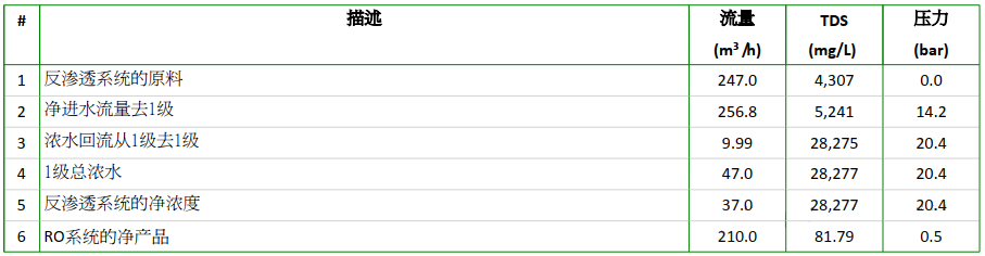 反滲透進(jìn)水為預(yù)處理的高鹽水,進(jìn)水鹽分為4300mg/L,產(chǎn)水量為210m3/h,回收率要求為85%,由于現(xiàn)場(chǎng)空間非常緊張,無法做單獨(dú)的濃水反滲透,直接做成三段式一級(jí)反滲透。