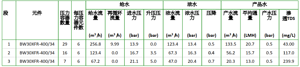 膜殼排列比按照29:16:7考慮(接近4:2:1),并設(shè)置段間增壓,采用wave軟件模擬,調(diào)整排列比及段間增壓泵揚(yáng)程,確保段間通量差值在3-5LMH及后段末端膜濃水量高于前段即可。同時(shí)因膜元件回收率超限,設(shè)置了濃水內(nèi)回流10m3/h。
